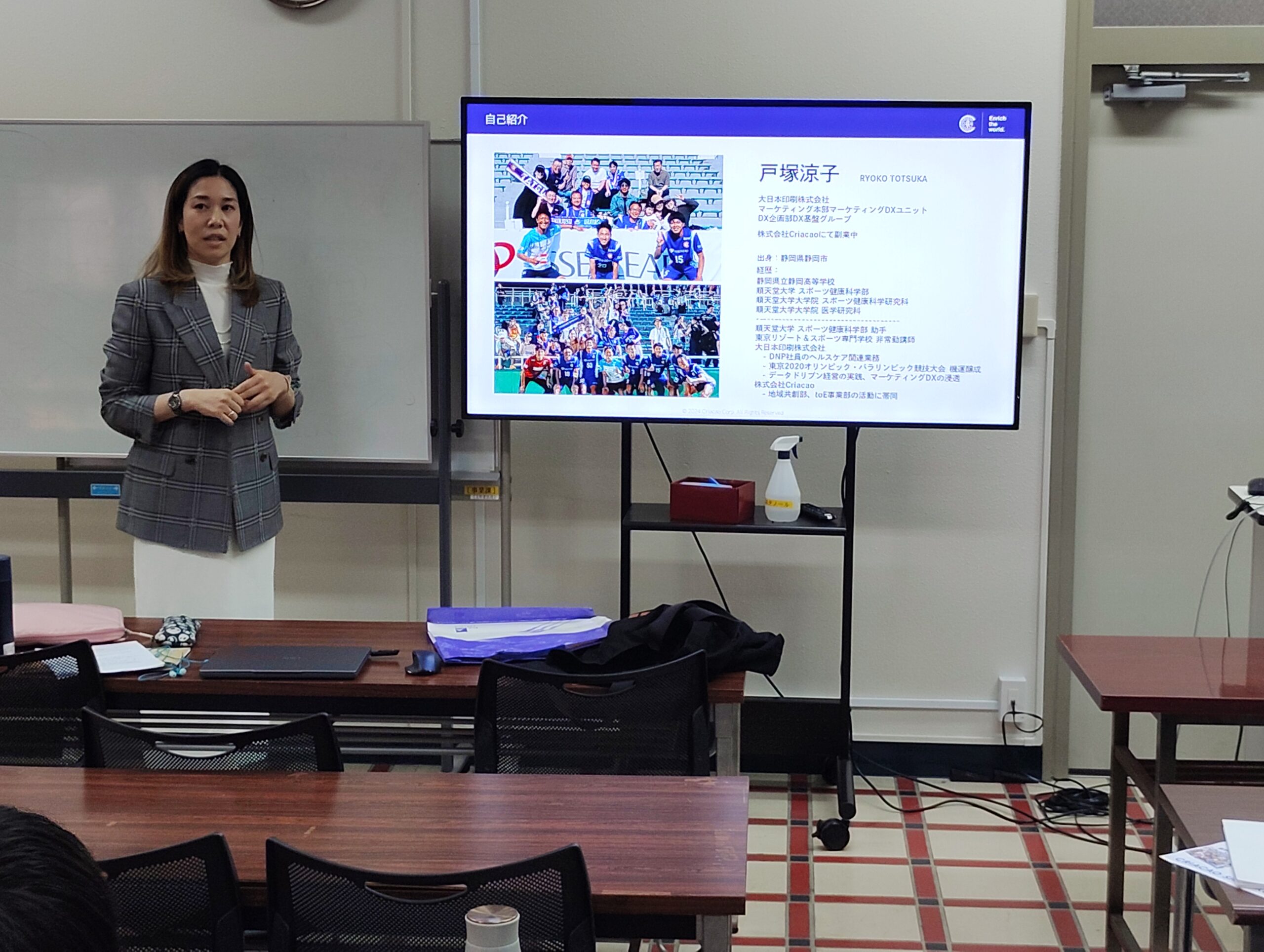 11/19(水)には「スポンサーシップと地域企業との連携」をテーマとして、「クリアソン新宿」のパートナー企業の一つである、大日本印刷株式会社マーケティング本部所属の戸塚涼子様にお越しいただき、同社とクリアソン新宿のパートナーシップ契約の経緯や同社の協賛活動などについてお話ししていただきました。戸塚様は現在、株式会社Criacao地域共創部(「クリアソン新宿」)の活動にも帯同しておられます。また、戸塚様には今後同社と「クリアソン新宿」でより連携を深めていきたい領域についても語っていただきました。さらに、学生たちからの質問にも率直にお答えしていただきました。就職活動中の学生も多いので、キャリアについて学びを深める機会にもなりました。